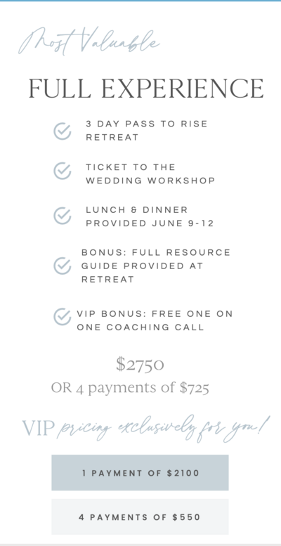 Yes! The Wedding Workshop is a one-day experience that can be attended on its own or added onto your retreat for a discounted rate. Whether you’re just starting weddings or want to elevate your approach, it’s packed with strategy, posing, and an epic styled shoot.