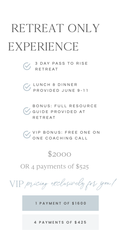 No problem! We offer flexible payment plans for all retreat bundles—during VIP access, you can secure your spot with 1 of 4 monthly payments. Just select the payment plan option when you register!