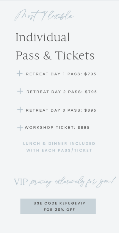You can join us for a single day, pick the days that speak to you most, or attend the full retreat+workshop